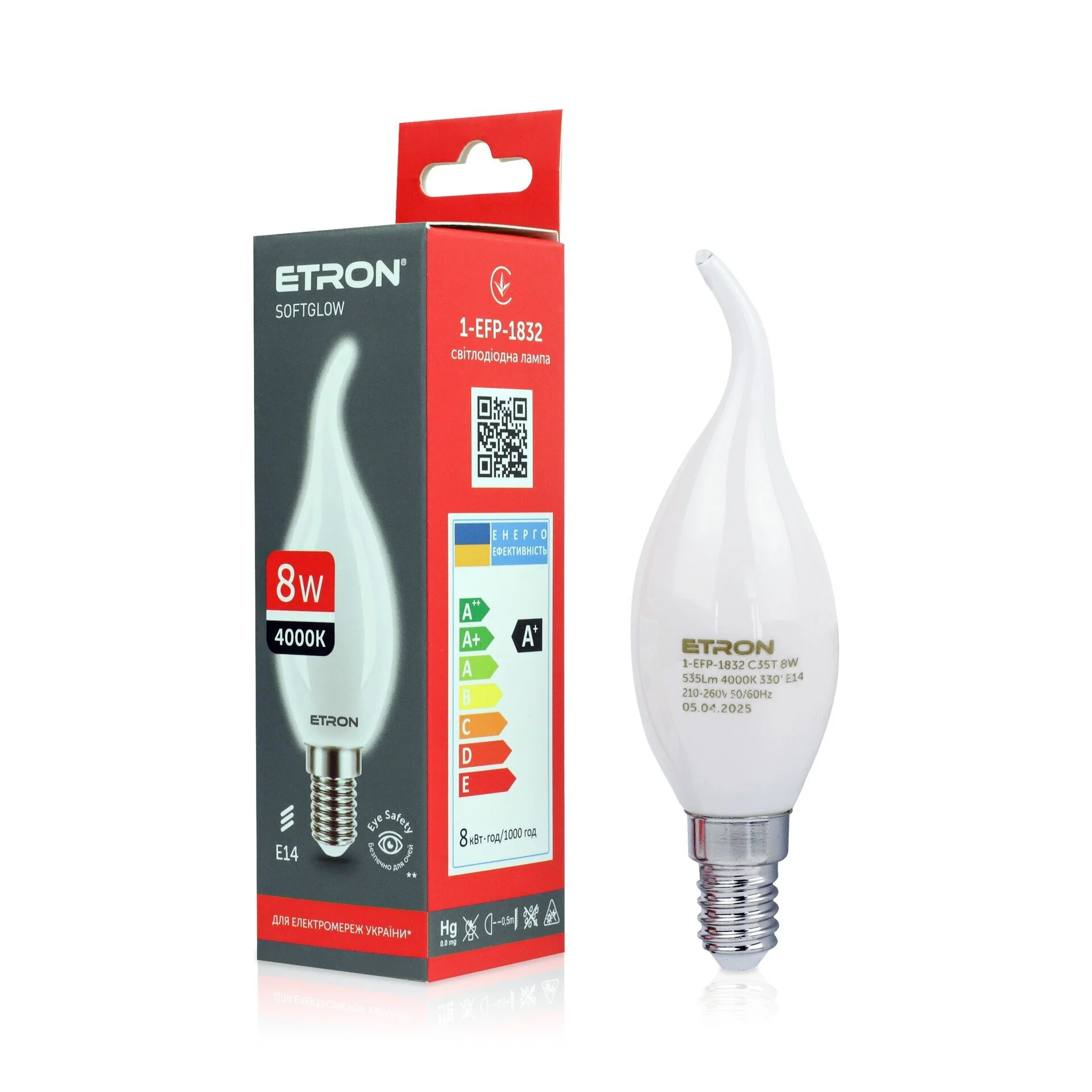 Светодиодная филаментная лампа ETRON SoftGlow C35T 8W 4000K E14 матовая колба (свеча на ветру)