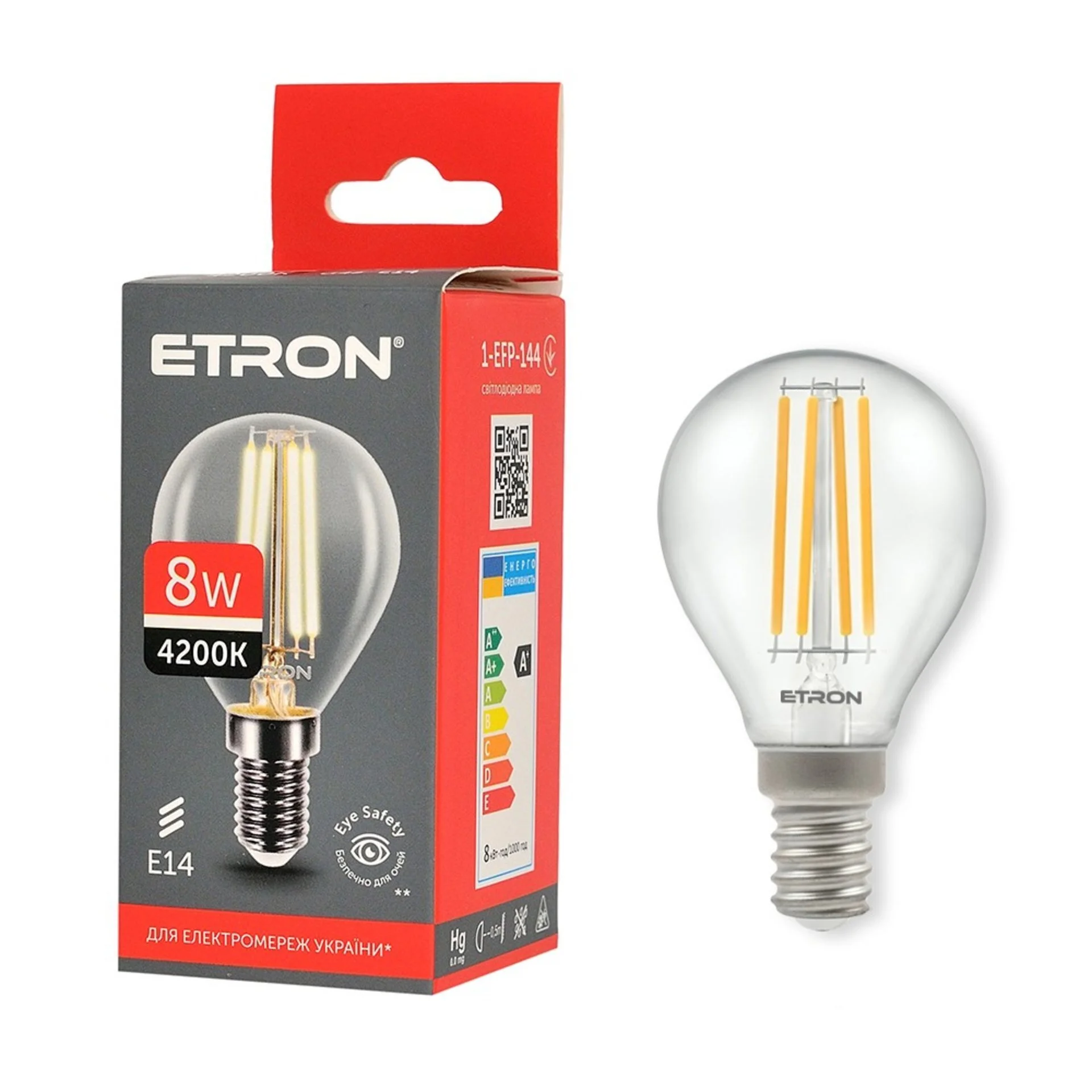 Светодиодная филаментная лампа ETRON G45 8W E14 4200K прозрачная создаёт яркий нейтральный свет, идеально подходящий для внутреннего освещения жилых помещений, таких как кухни, рабочие кабинеты и гостиные. Благодаря цоколю E14 она подходит для компактных светильников, бра и люстр.