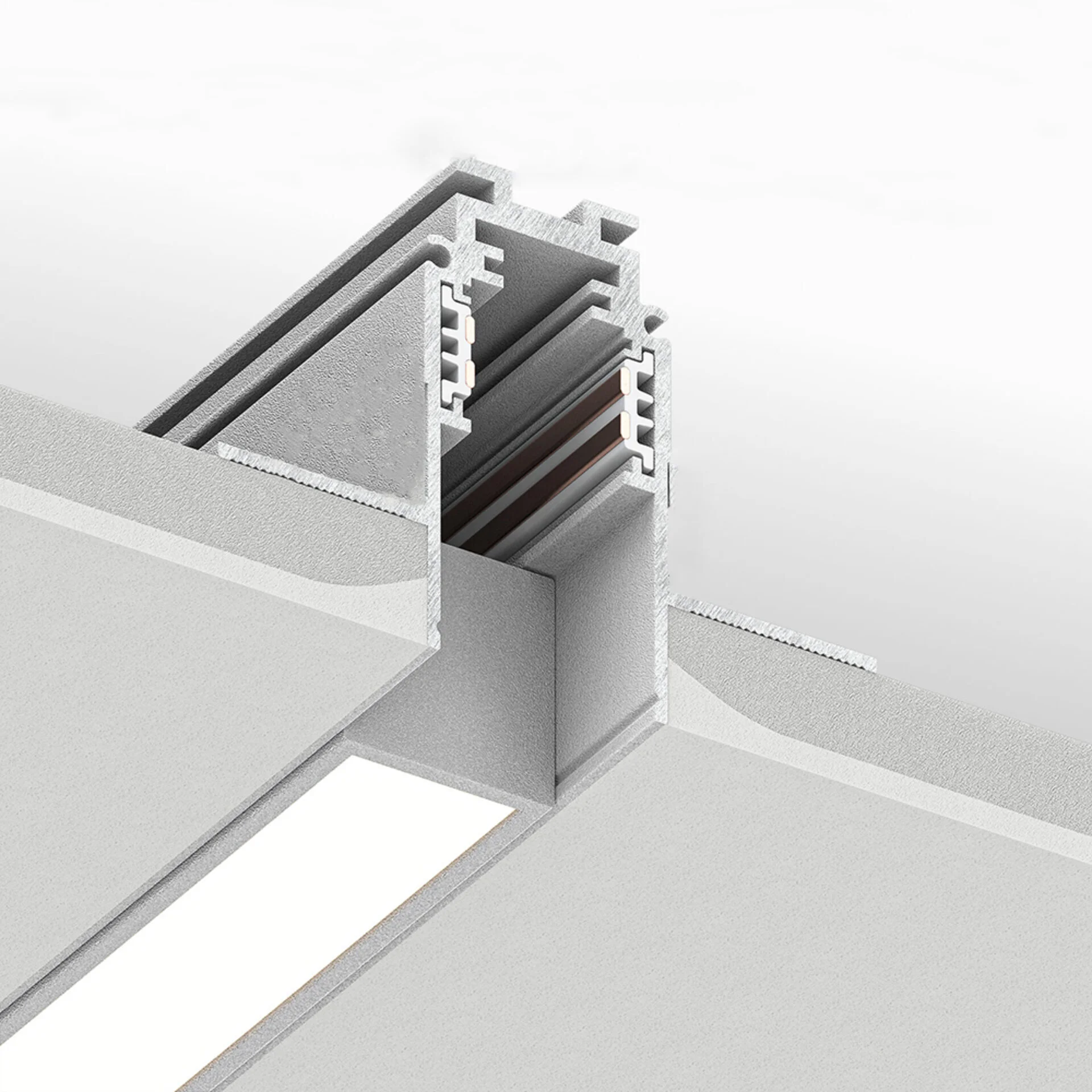 Мідні струмопровідні доріжки всередині шинопроводу забезпечують стабільну подачу електроенергії, мінімізують втрати напруги та сприяють надійній роботі освітлення. Завдяки наявності заглушок система виглядає завершеною, а її внутрішні елементи захищені від пилу та механічних пошкоджень.