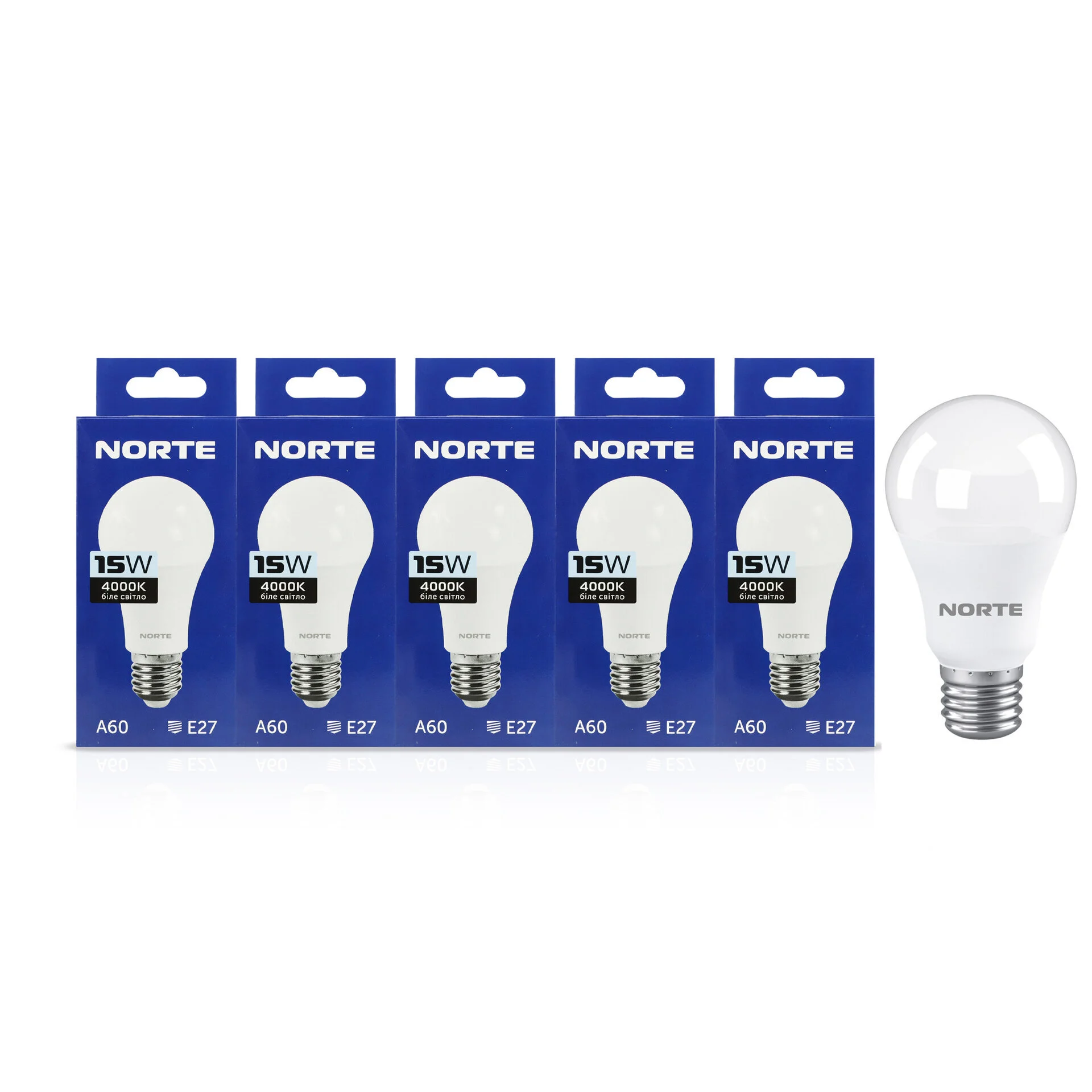 NORTE 1-NLP-1704 — це набір із 5 яскравих світлодіодних ламп стандартної форми A65 з універсальним цоколем E27. Вони ідеально підходять для основного освітлення в будинку, офісі, магазинах чи інших приміщеннях.