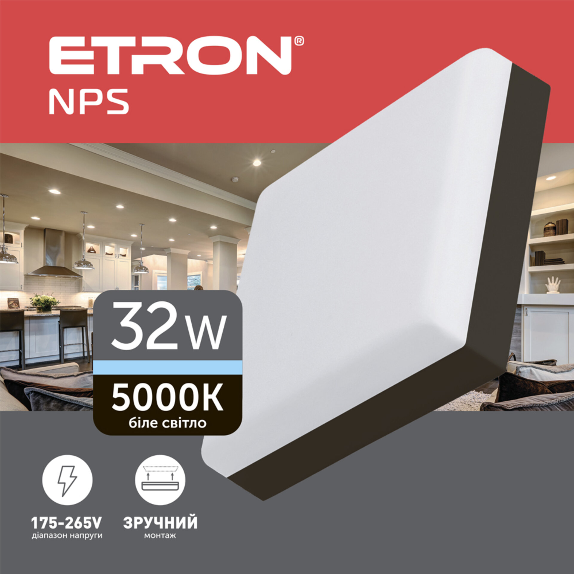 ETRON NPS 32W квадрат — вдалий вибір, якщо потрібен надійний LED світильник 32W 5000K у стриманому чорному виконанні. Світильник легко поєднується зі світлими та темними інтер’єрами й створює акуратний візуальний акцент на стелі.