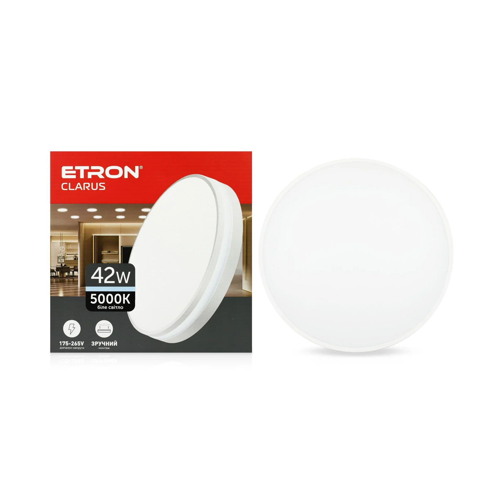 ETRON Clarus 42W — практичний вибір для тих, хто шукає LED світильник 42W 5000K у стриманому дизайні. Він підходить для регулярного використання в приміщеннях з типовими умовами експлуатації та допомагає організувати стабільне освітлення на кожен день.