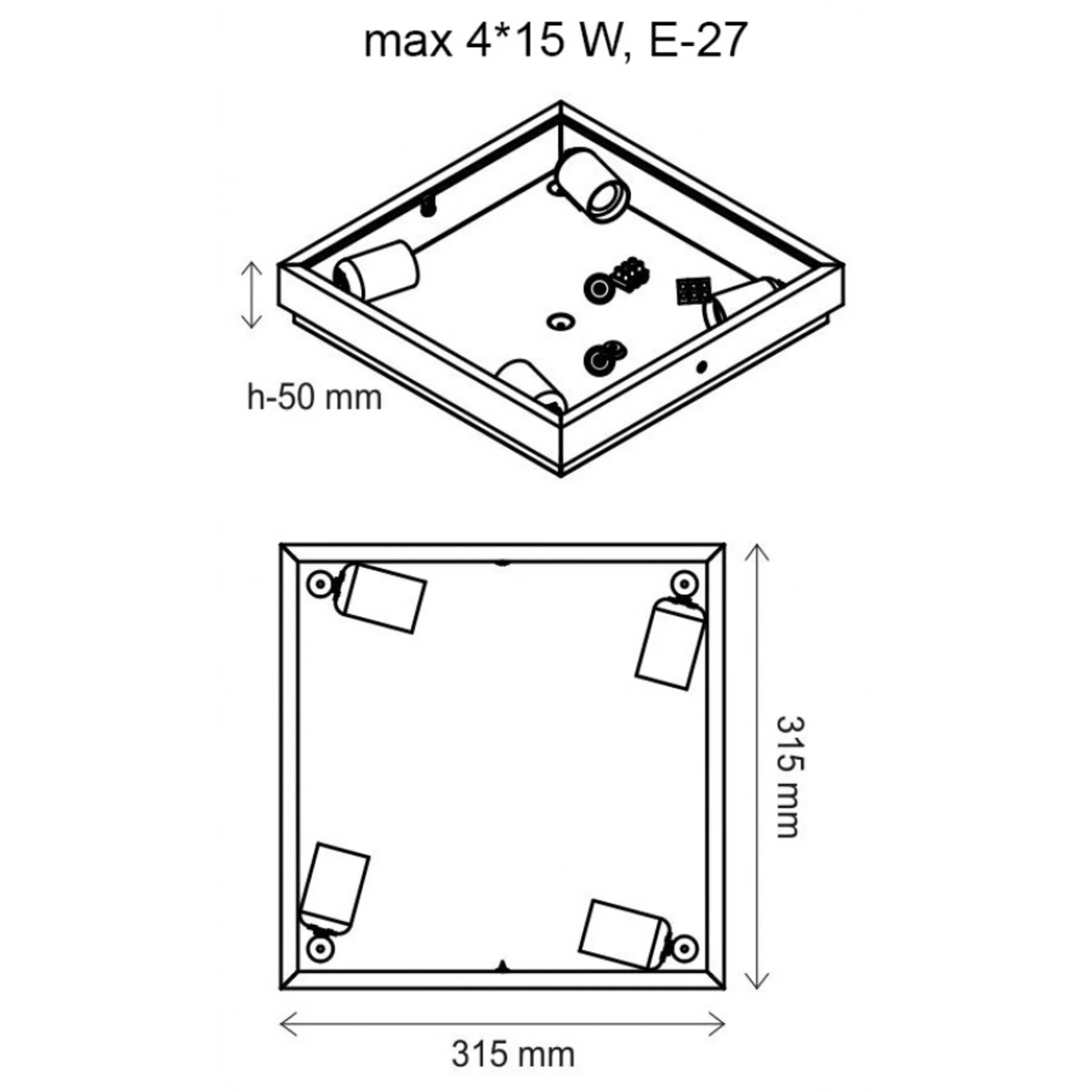 Завдяки своїм параметрам (315 мм довжина та ширина) та чотирьом джерелам світла, світильник забезпечує якісне освітлення навіть у великих приміщеннях. Простий накладний монтаж дозволяє легко встановити світильник у потрібному місці, а спрямоване освітлення вниз і в бік створює затишну атмосферу.