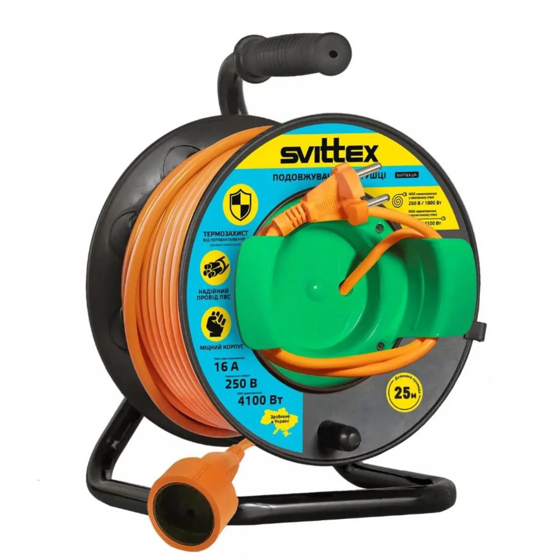 Потужний та надійний подовжувач SVITTEX розроблений для виконання складних завдань із підключення електроприладів. Завдяки довжині кабелю 25 метрів та додатковому кабелю з вилкою довжиною 1,3 м, він забезпечує максимальну зручність у використанні. Подовжувач підходить для дому, офісу, майстерні та будівельних об'єктів.