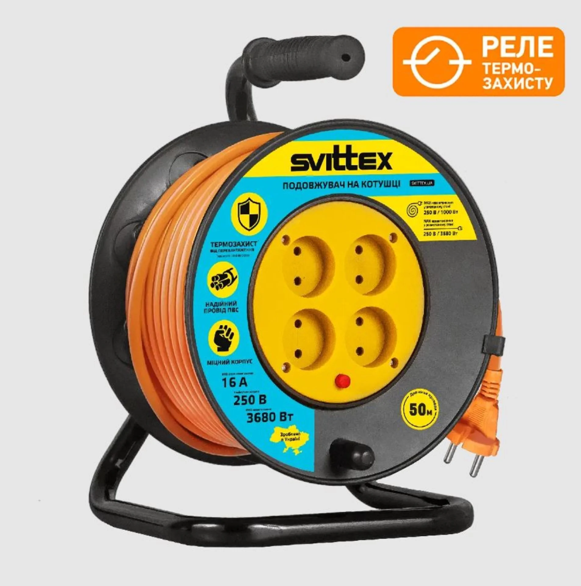 Замовте подовжувач SVITTEX 50 м вже сьогодні, щоб забезпечити себе надійним пристроєм для будь-яких потреб. Завдяки своїй довжині, термозахисту та міцній конструкції, цей подовжувач стане вашим незамінним помічником!