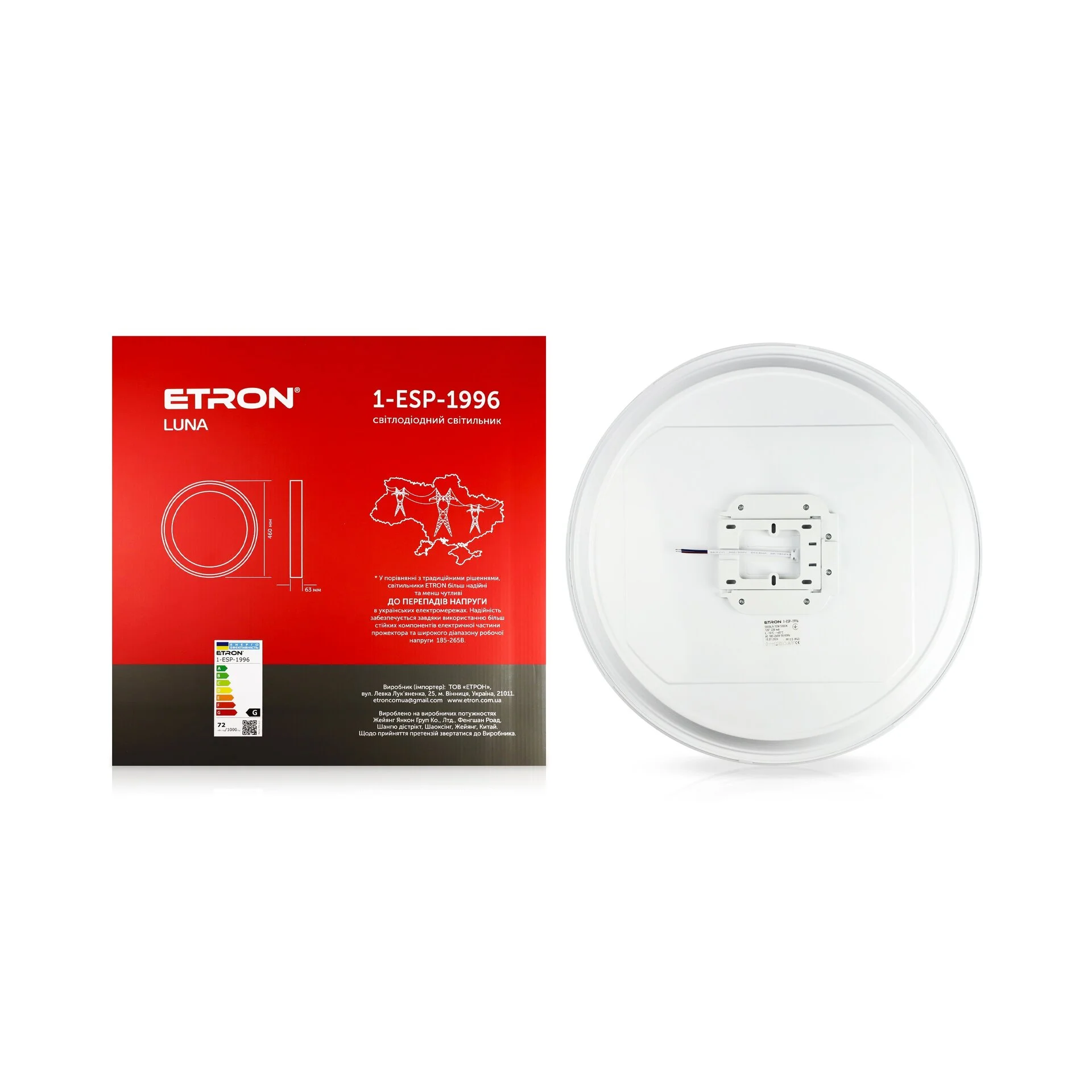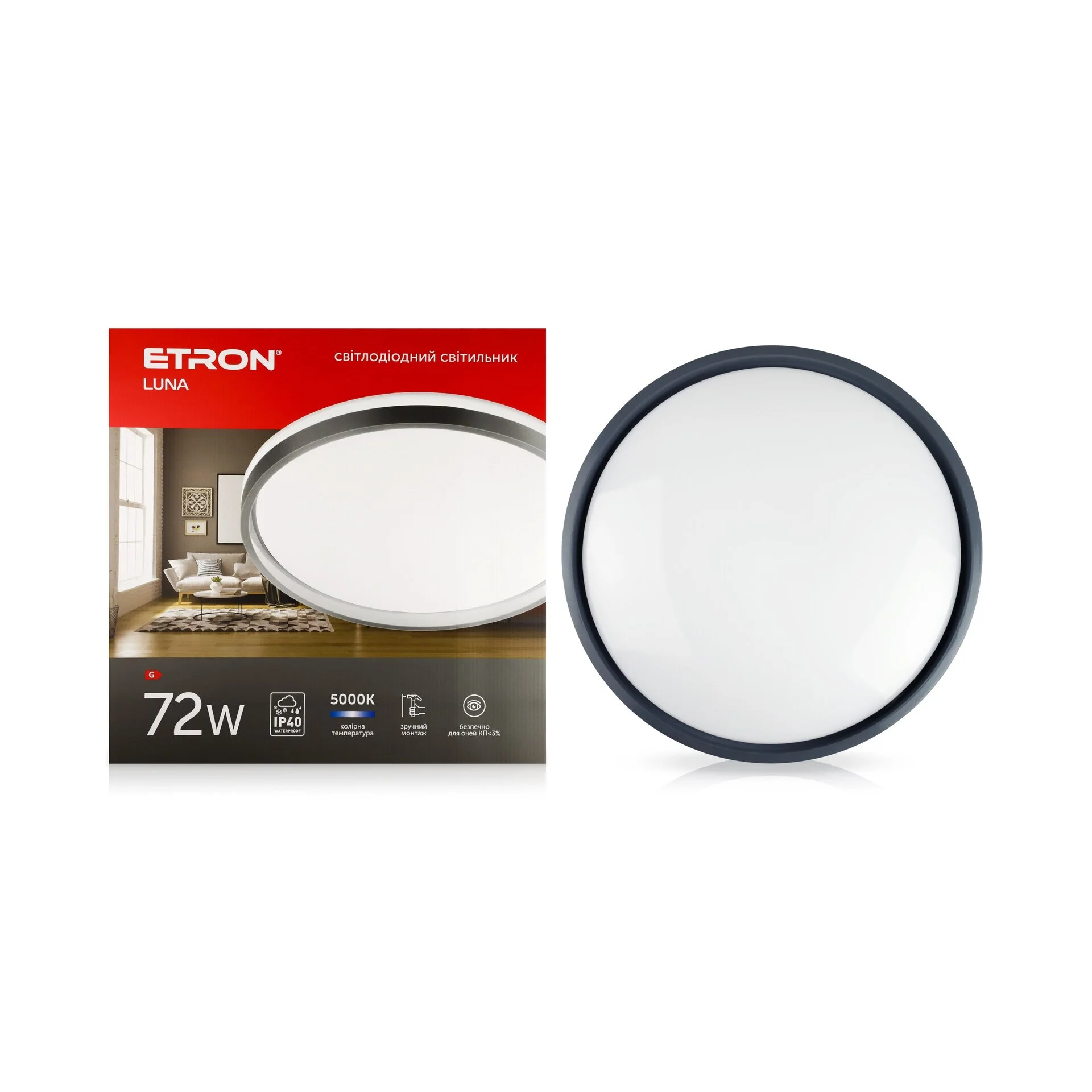 ETRON LUNA 1-ESP-1996 — світлодіодний стельовий світильник у сірому корпусі для основного освітлення житлових і комерційних приміщень. Потужність 72 Вт, нейтральне світло 5000K та сучасний дизайн роблять модель практичним рішенням для вітальні, спальні, кухні, коридору, кабінету чи офісу.