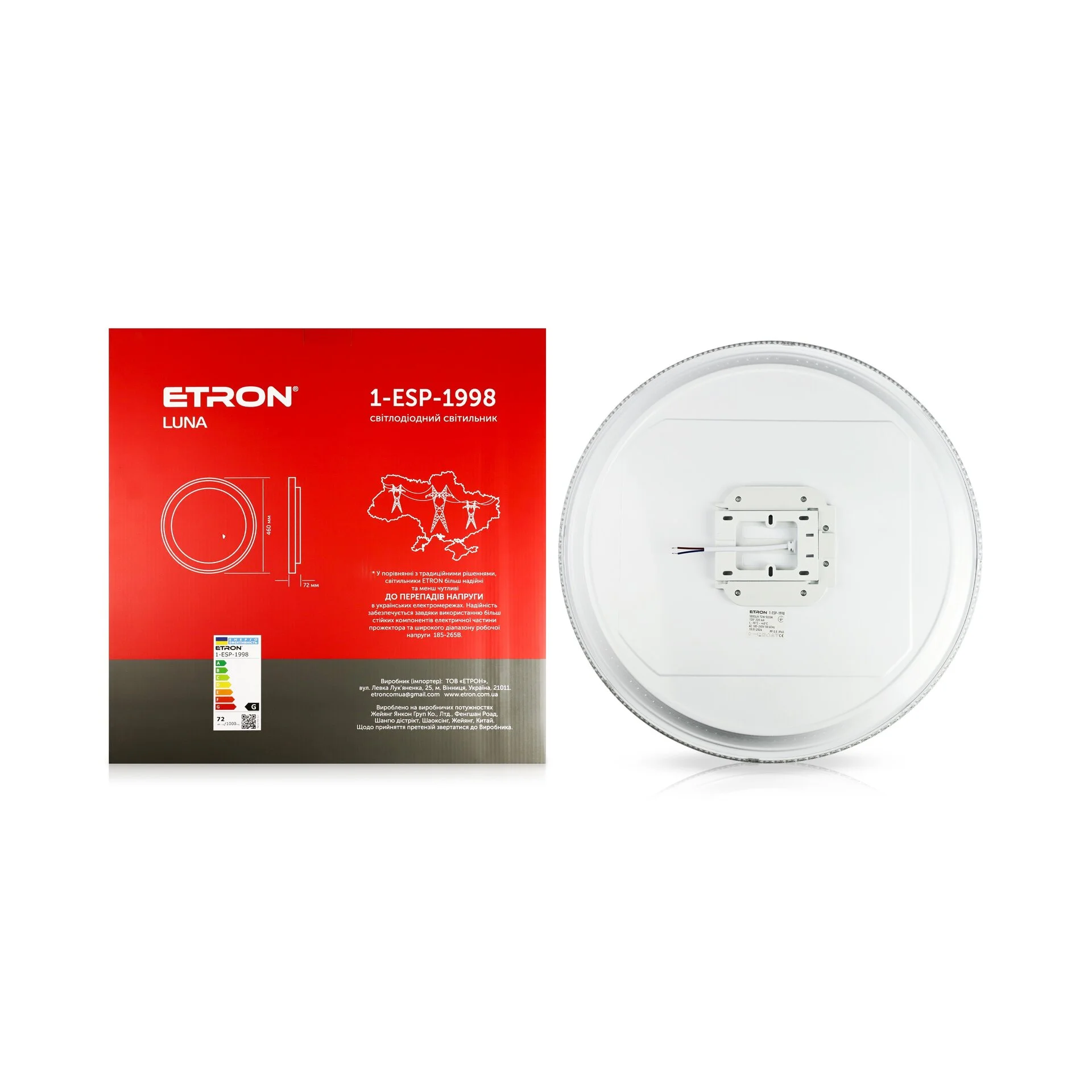 ETRON LUNA crystal 1-ESP-1998 — світлодіодний стельовий світильник з декоративним кристальним оформленням для основного освітлення житлових і комерційних приміщень. Потужність 72 Вт, нейтральне світло 5000K та виразний дизайн роблять модель доречною для вітальні, спальні, кухні, коридору, кабінету, салону або офісу.