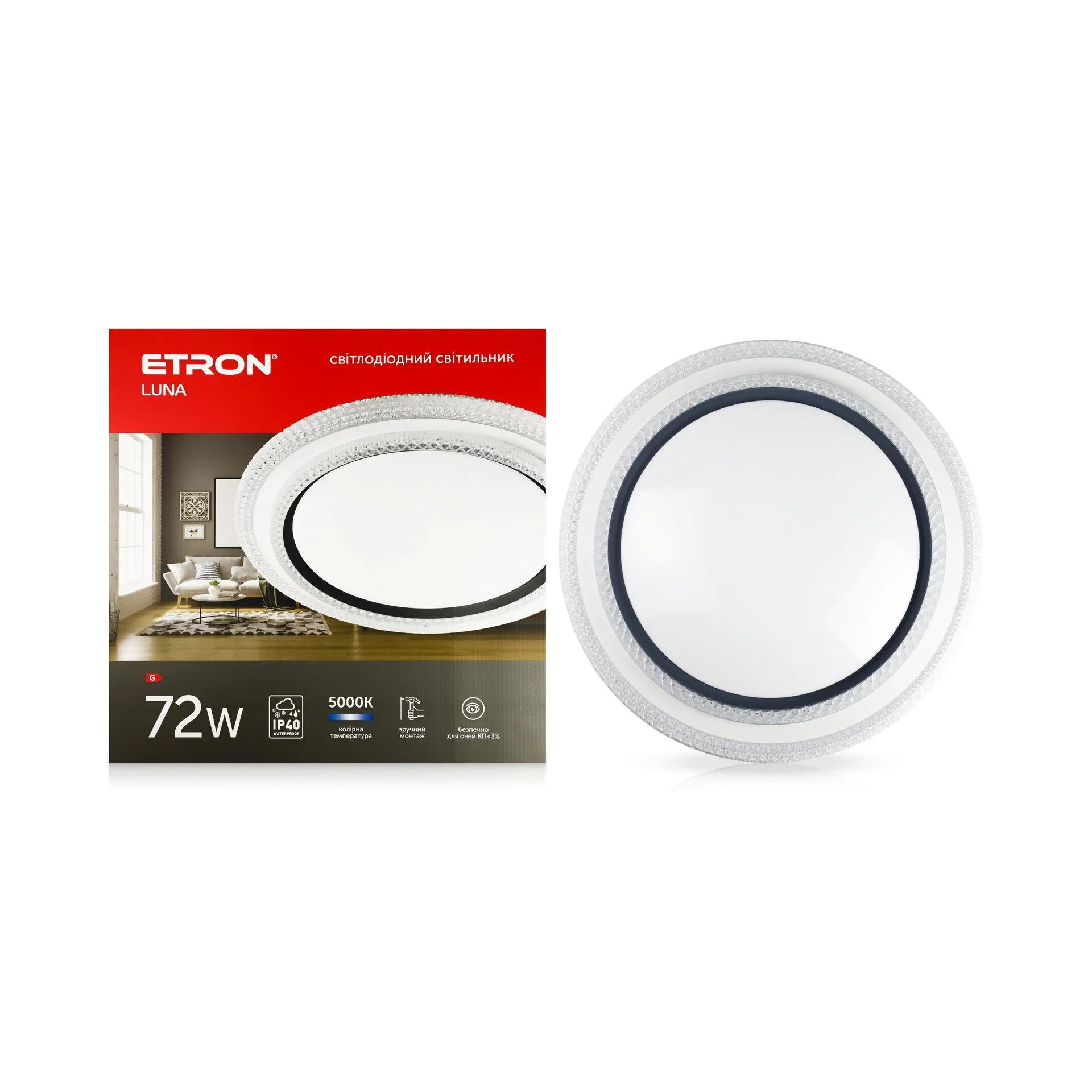 Світлодіодний світильник ETRON LUNA crystal 72W 5000K — вдалий вибір для тих, хто шукає потужний LED-світильник із нейтральним світлом, акуратним монтажем та декоративним кристальним акцентом.