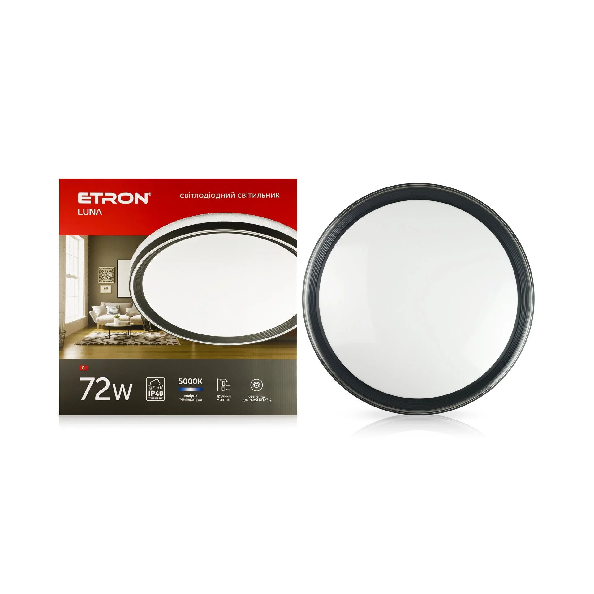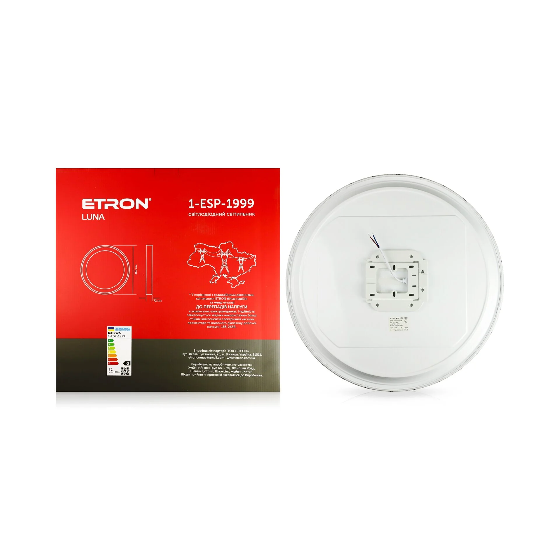 ETRON LUNA crystal 1-ESP-1999 — світлодіодний стельовий світильник з декоративним кристальним оформленням для основного освітлення житлових і комерційних приміщень. Потужність 72 Вт, нейтральне світло 5000K та виразний дизайн роблять модель доречною для вітальні, спальні, кухні, коридору, кабінету, салону або офісу.