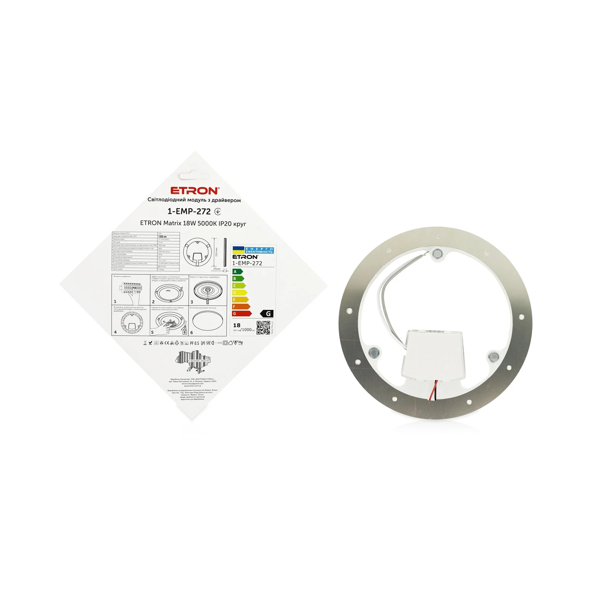 ETRON 1-EMP-272 Matrix 18W — компактний світлодіодний модуль круглої форми для оновлення або ремонту світильників. Модуль дає рівне нейтрально-біле світло 5000K, яке добре підходить для щоденних побутових і робочих задач: кухня, коридор, передпокій, підсобні приміщення, технічні зони.