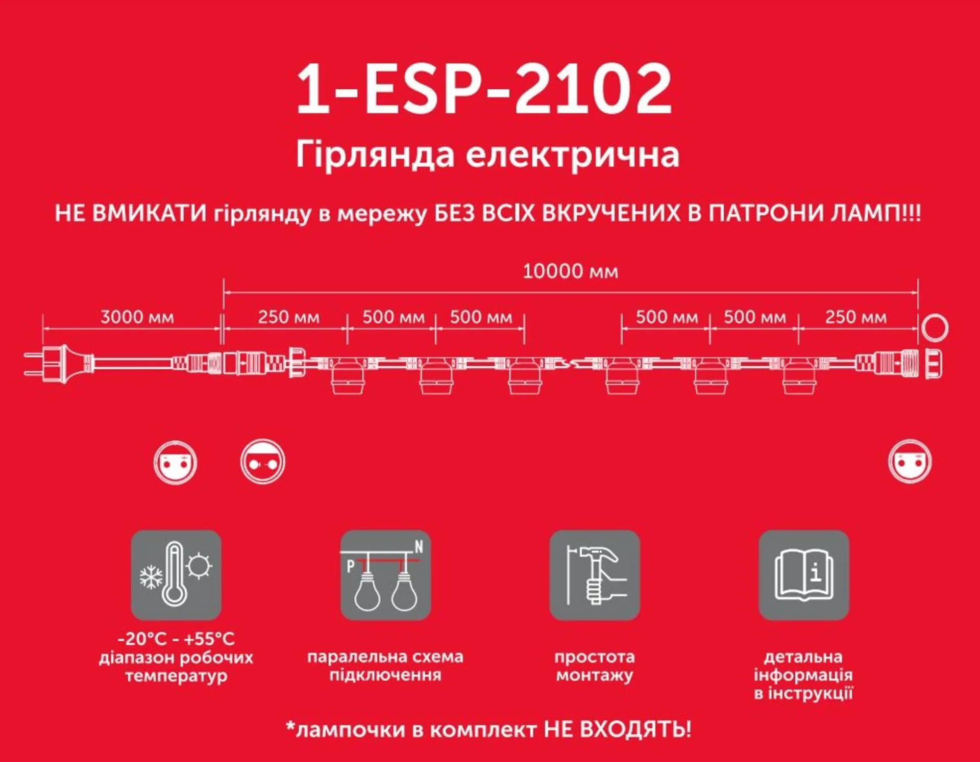 | Довжина дроту з лампами | 10 метрів |