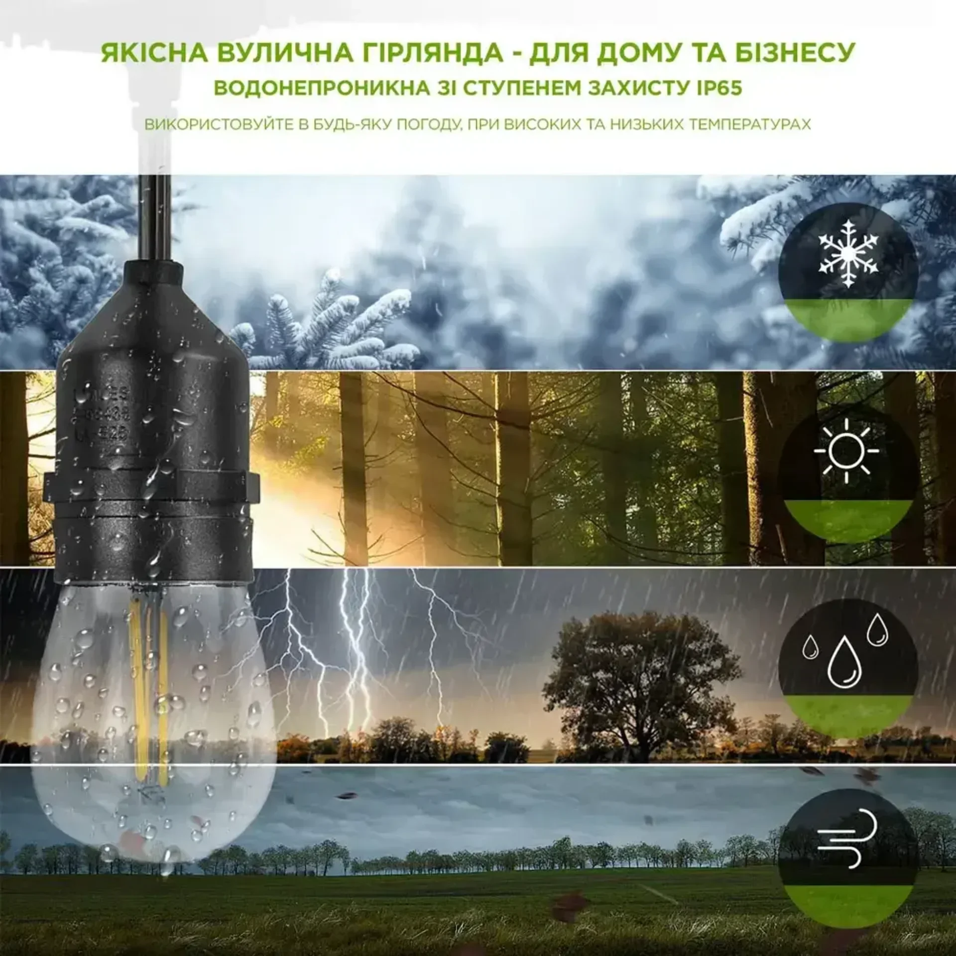 Шукаєте надійне рішення для створення святкової атмосфери у будь-яких погодних умовах? Представляємо вам вуличну гірлянду ETRON 1-ESP-2102, яка поєднує в собі функціональність, довговічність і сучасний дизайн. Ця гірлянда стане ідеальним вибором для прикрашання терас, садів, кафе або інших відкритих просторів.