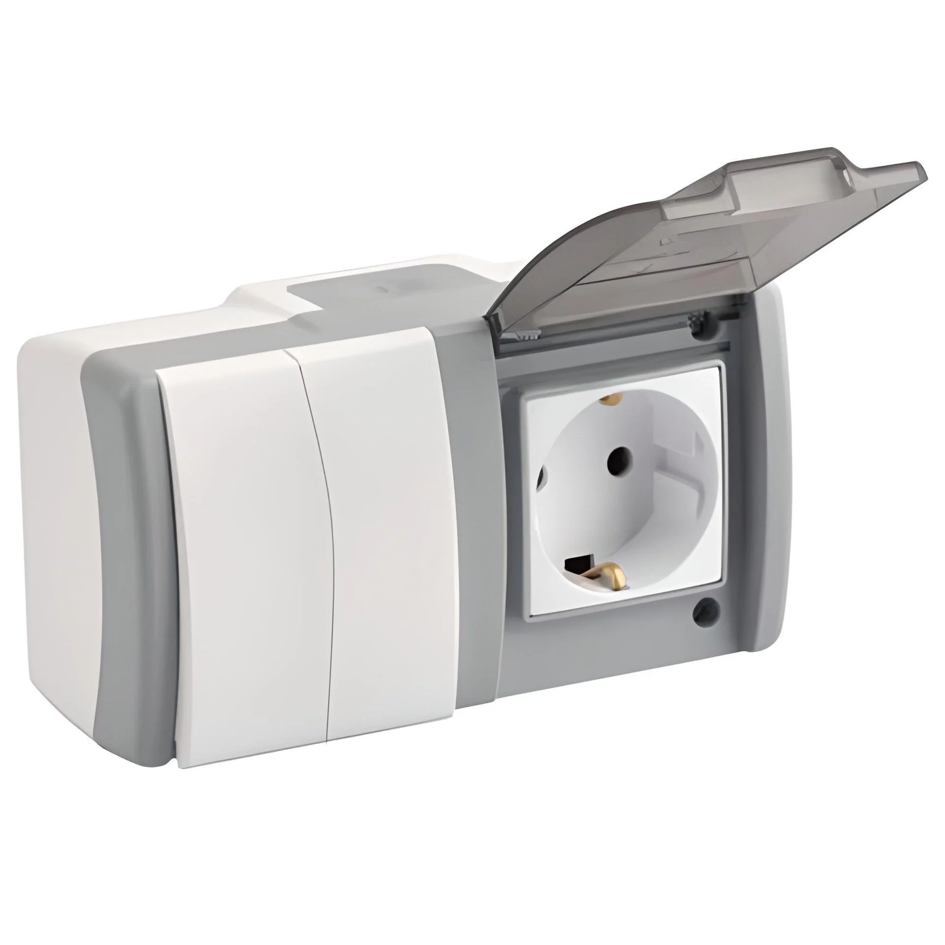 Mono Electric OCTANS IP54 – це зручне поєднання двоклавішного вимикача та розетки з заземленням і захисною кришкою. Високий ступінь захисту IP54 забезпечує стійкість до пилу та вологи, що робить його ідеальним для зовнішньої установки.